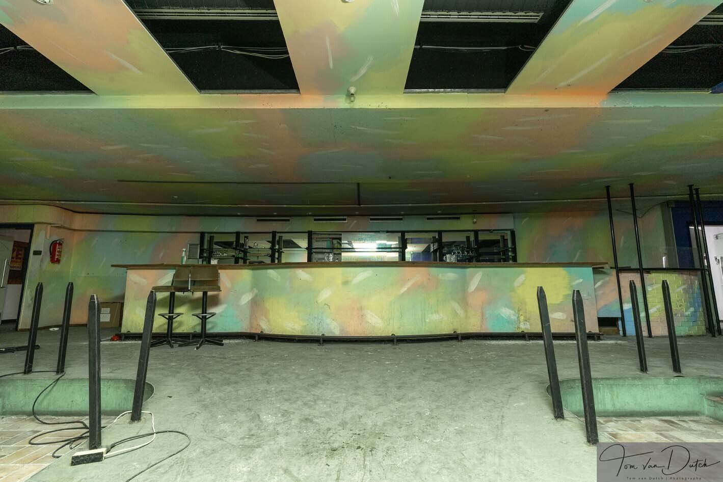 Der Saal ist bis auf zwei Bartresen leer. Er ist zuletzt als Disko genutzt worden.