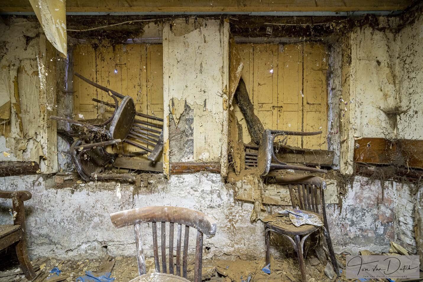 Spinnweben die fast so dicht wie ein Vorhang sind, durchgebrochene Decken und teilweise verstreute Unterlagen.