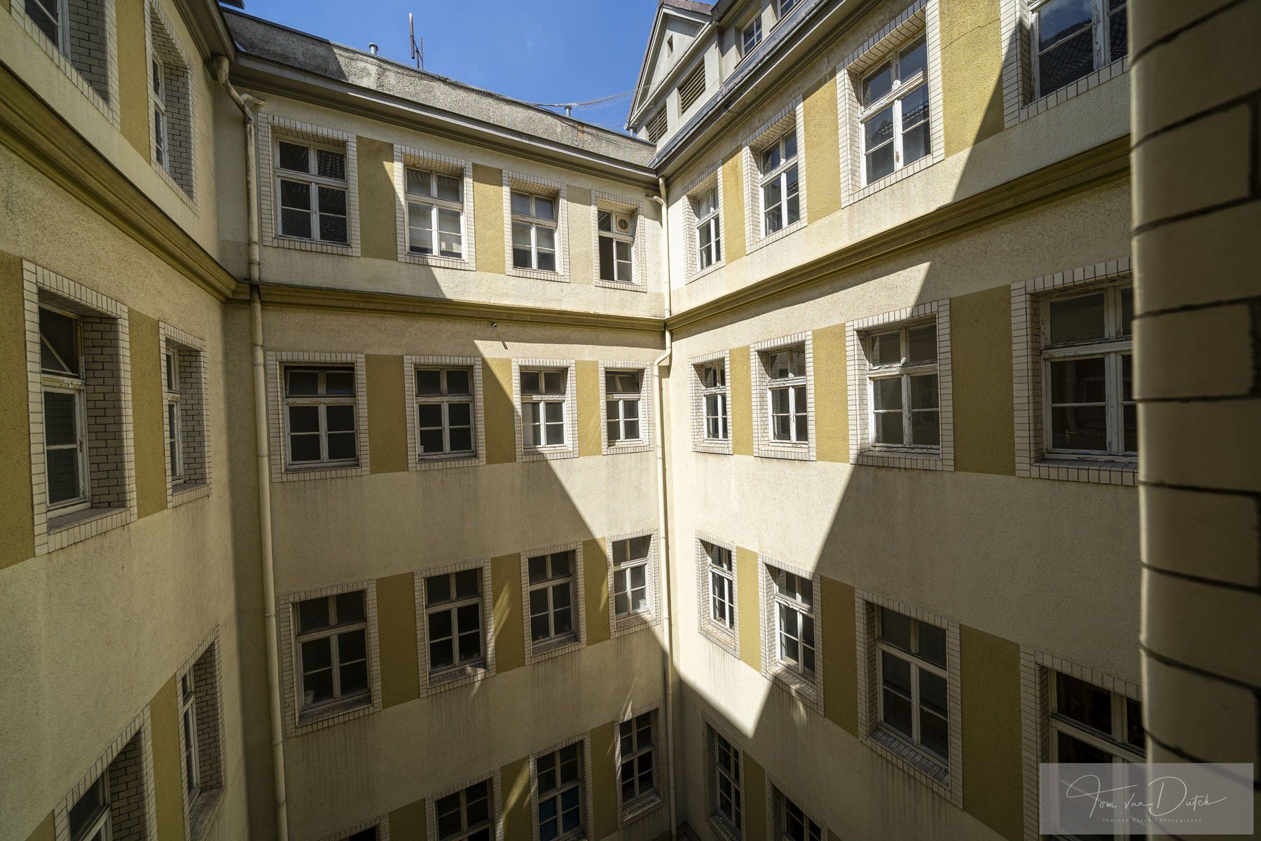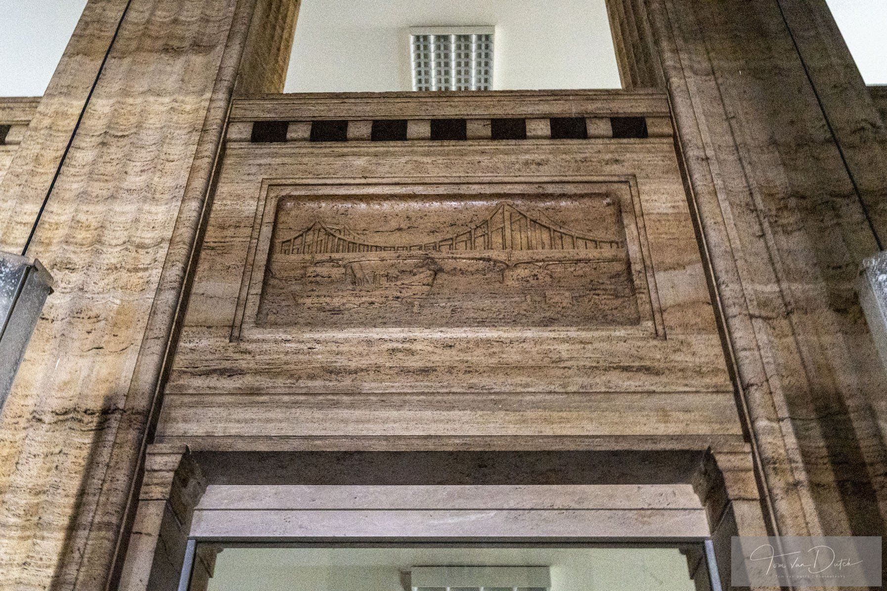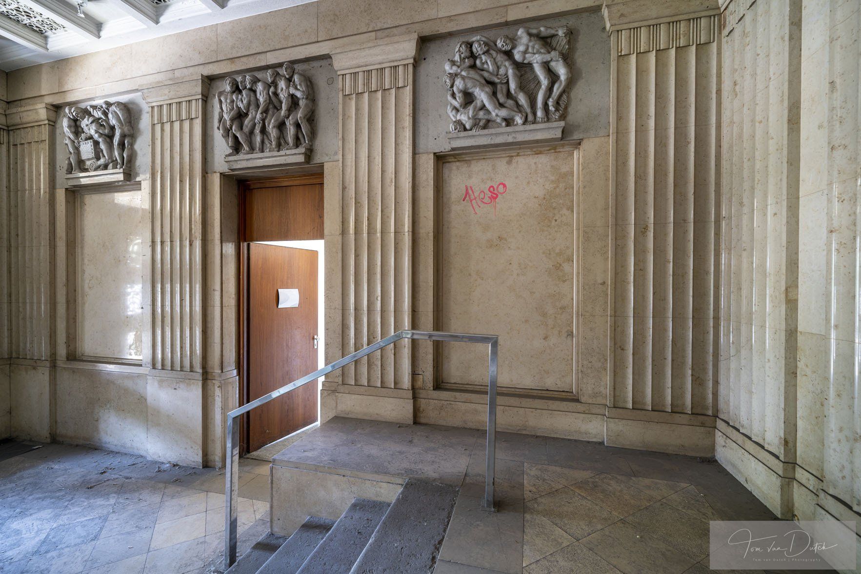 Im Inneren des Gebäudes finden sich Motive aus der Montanindustrie, sowie Maschinengewehr, Füllhorn und Lorbeerkranz.