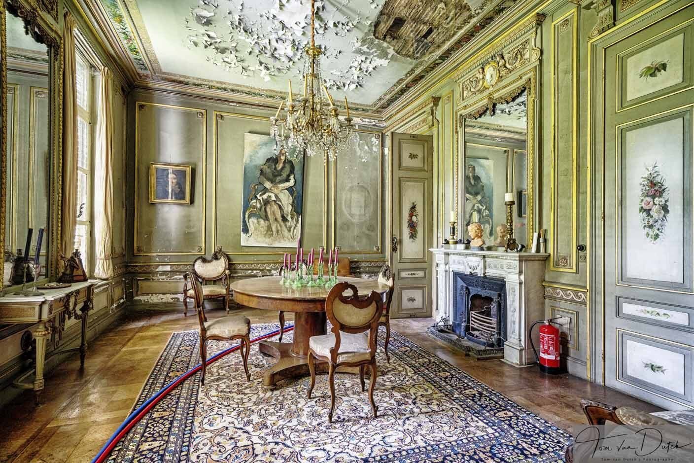 Kamine, ein Flügel, noble Möbel, Kronleuchter und Gemälde.