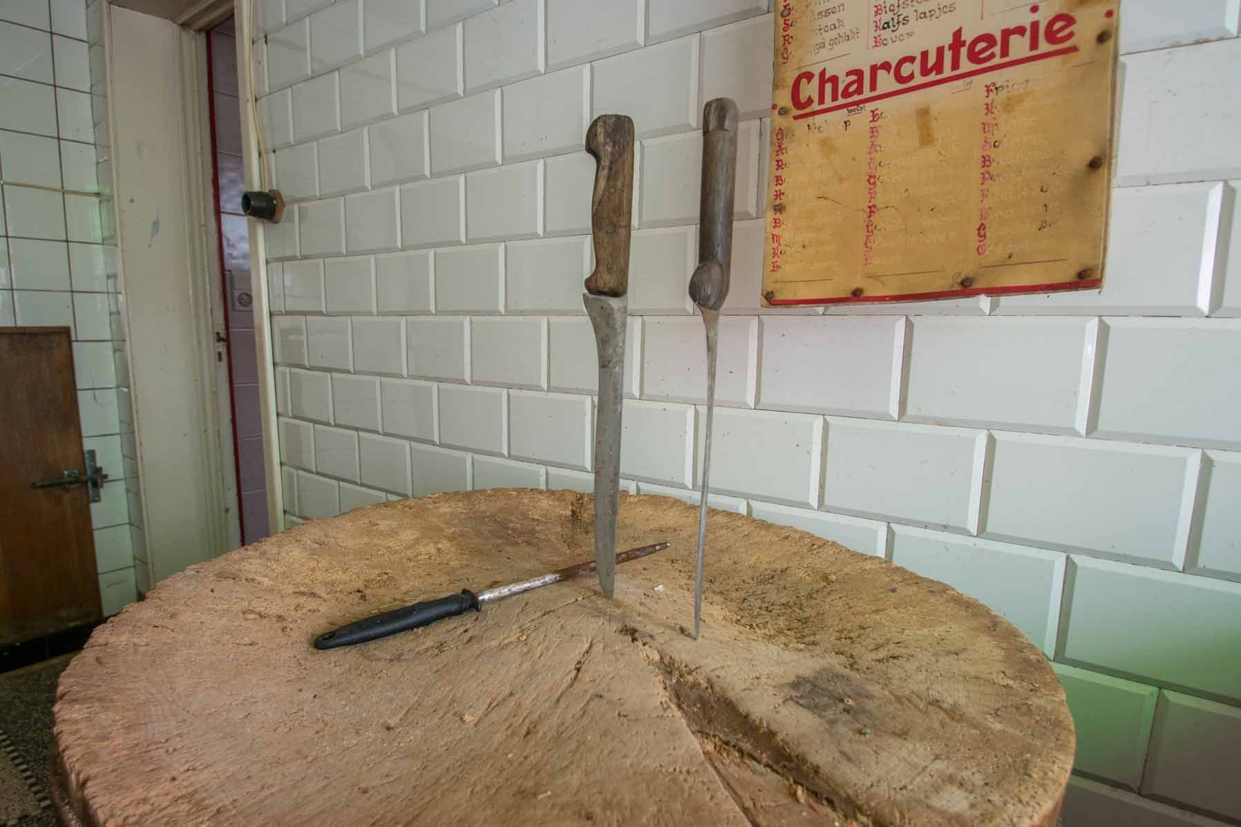 Das Messer steckt im Holzblock, der Fleischwolf sieht aus wie grade noch benutzt, die Kühlkammer riecht noch nach Wurstwaren.