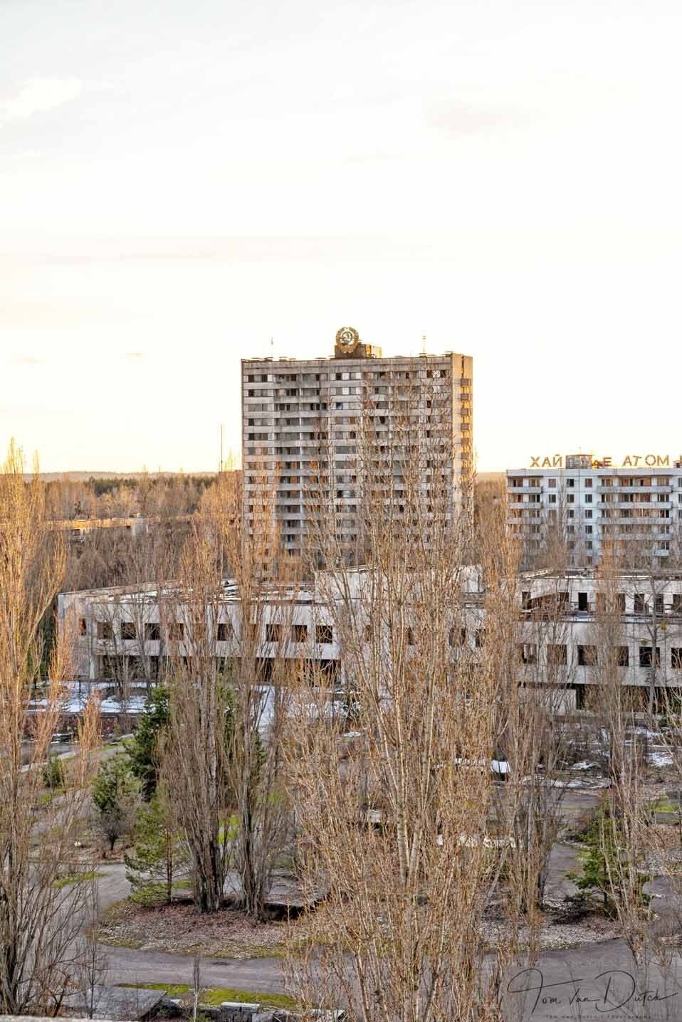 Um die Folgen der Katastrophe von Tschernobyl zu beseitigen, wurde das Hotelgebäude von den Liquidatoren genutzt. Beamte konnten hier schlafen und es gab ein Hauptquartier, in dem die Hubschrauberaktionen koordiniert wurden. Vom Hoteldach aus war das Kernkraftwerk Tschernobyl deutlich zu erkennen. Hubschrauber, die Sand, Blei und Borsäure in den brennenden Reaktor schütteten, wurden von Beobachtern auf dem Dach des Hotels geleitet.