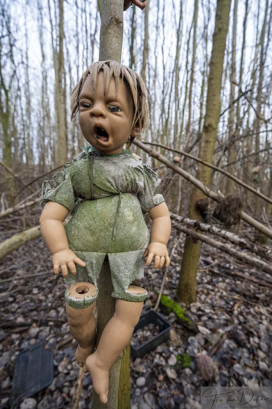 In Anlehnung an diese Insel, hat jemand in einem kleinen Waldstück ebenfalls etliche verstümmelte Puppen in die Bäume gehängt.