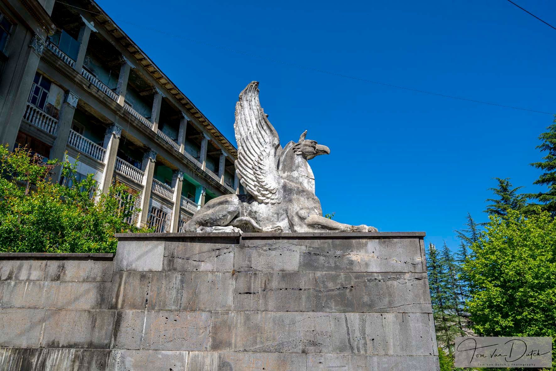 Das siebenstöckige Sanatorium Tbilisi in der Nähe des Stadtzentrums und der Badehäuser gehörte ursprünglich dem Kommunikationsministerium der UdSSR. Es stammt aus dem Jahr 1951 und ist heute eines von mehreren Gebäuden in Tskaltubo, in denen Binnenvertriebene untergebracht sind. In den oberen Stockwerken, die auch recht uninteressant sind, leben die Flüchtlinge. Ansonsten ist im Inneren nur der verwahrloste, aber stimmungsvolle und mit rankenden Pflanzen und Palmen bewachsene Innenhof interessant. Der Haupteingang wird von zwei großen, aus Stein gemeißelten Greifen bewacht.
