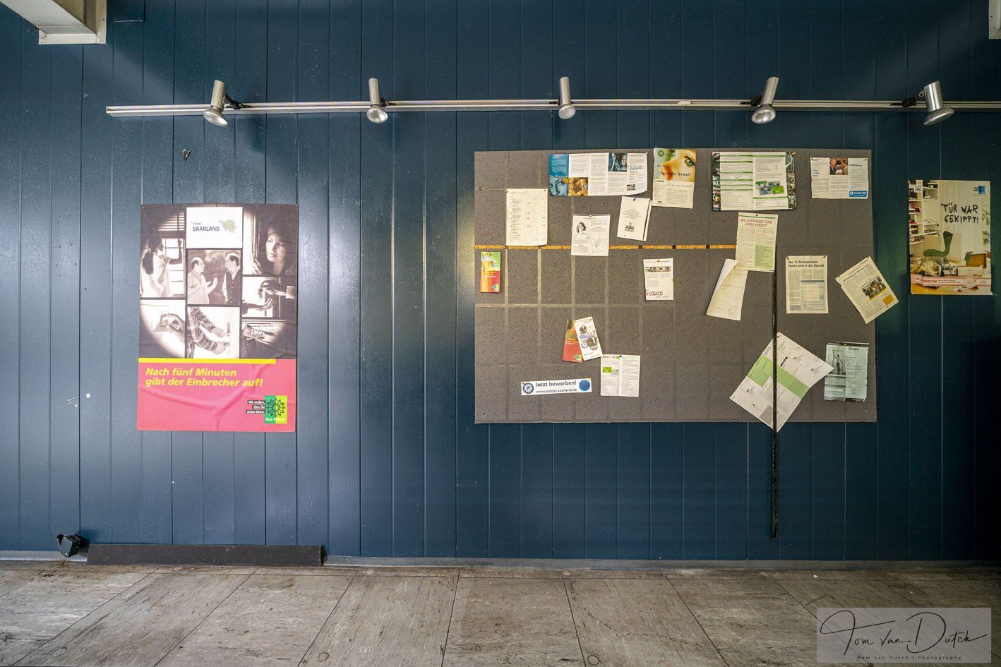 Im unteren, erheblich größeren Bereich finden wir Schwarze Bretter, Infotafeln, Schreibtische, Aktenordner sowie Türschilder mit der Aufschrift Landespolizeidirektion oder Landeskriminalamt.