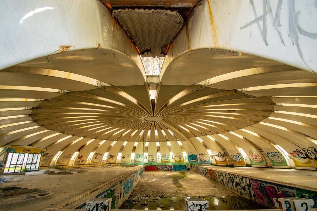 Die vom Ingenieur Thémis Constantinidis entwickelte Kuppel aus Polyesterfliesen besteht aus 36 Metallbögen, darunter 12 versenkbare, so dass im Sommer den Pool in einem Winkel von 120 ° geöffnet werden kann. Jeder zweite Bogen ist mit 7 Bullaugen durchbohrt, was zum futuristischen Erscheinungsbild der Arbeit beiträgt.